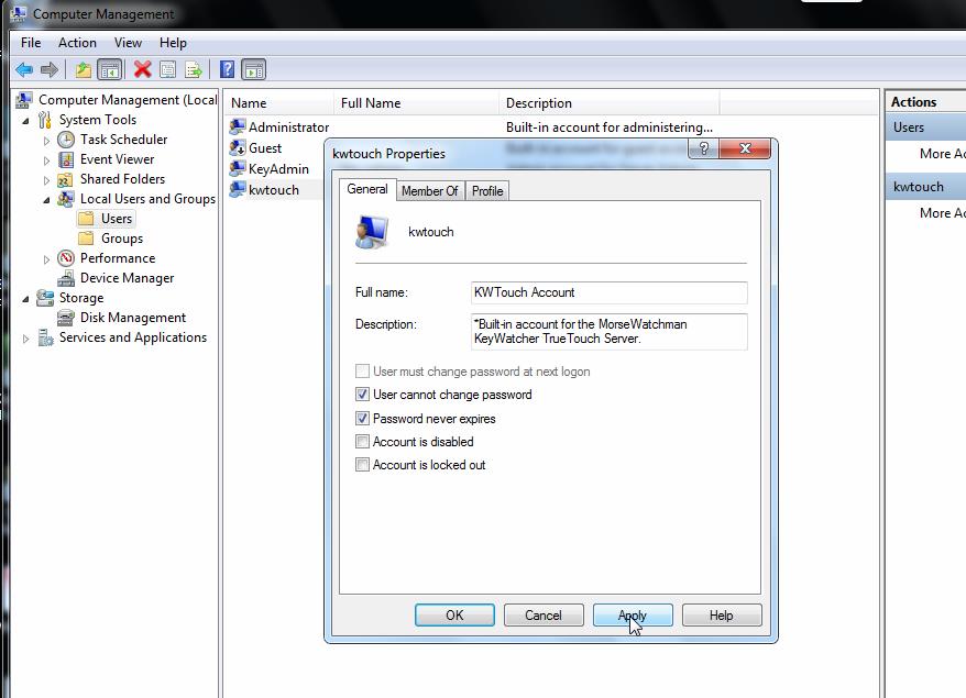 If the KeyWatcher TrueTouch client software cannot log in to the server, you need to make sure that the Windows login account isn't "disabled" or "locked out". The default is for Windows to lock it after 3 failed attempts.